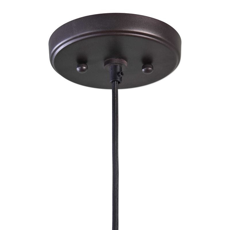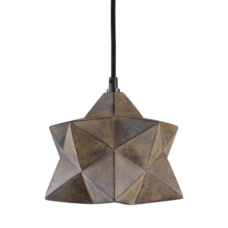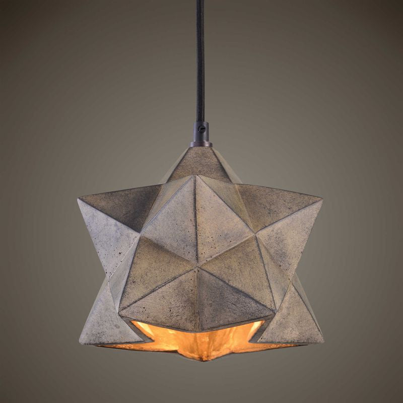 Antiqued concrete with black highlights and a rough hewn interior, give this geometric boulder pendant added interest. Features a black fabric covered cord.