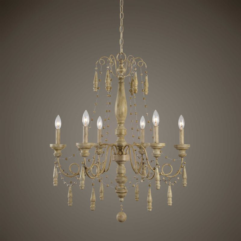 Transitional elegance is the best way to describe this turned wood detailed chandelier featuring a sea salt finish. The traditional chandelier roots show in the turned wood drops, wooden bobeches, and the wood beads threaded between washed nickel chains.