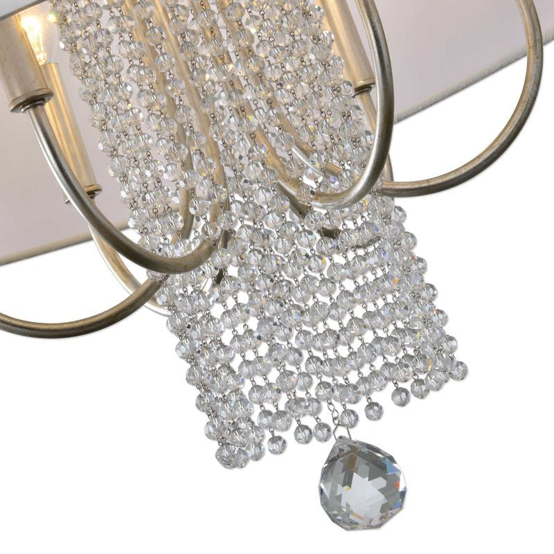 Refined silver leaf enriches this drum shade chandelier featuring a decorative band of princess cut crystals set in front of a white linen hardback fabric shade with a waterfall of graduated crystals spilling down the center.