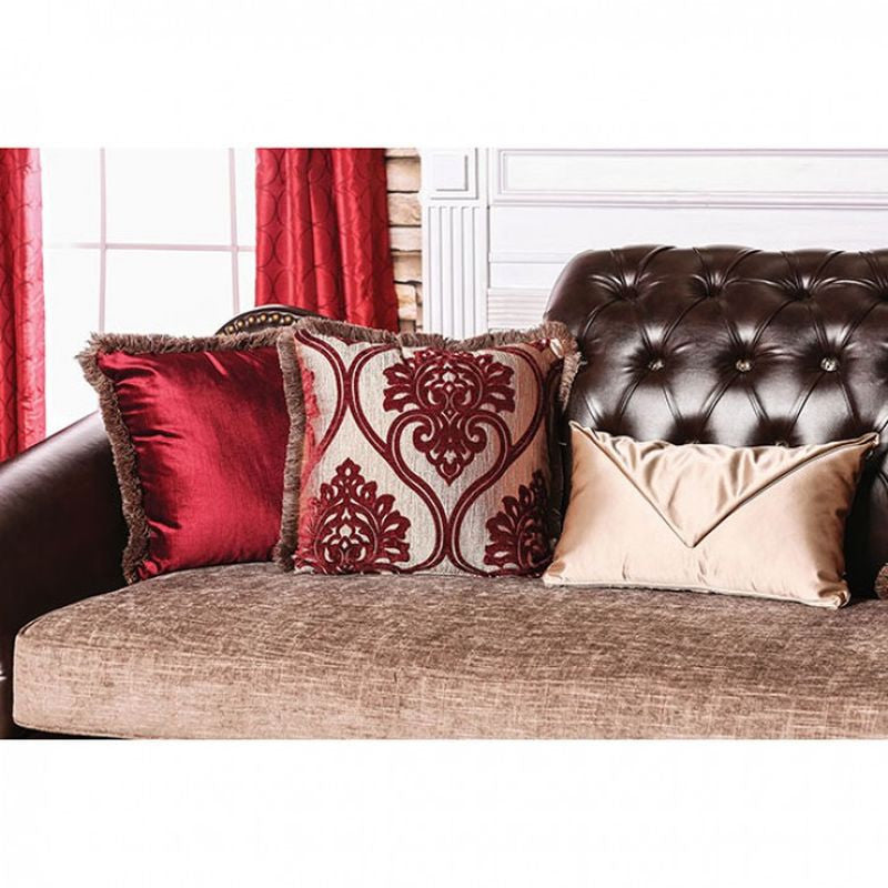 A stunning and extravagant design fit for any setting, this two-tone collection will instantly refine your living space with its tasteful coloring. Each piece features a brilliant balance of dark brown leatherette and tanned fabric, drawing attention to the uniquely tufted back and stylishly curved arms. Modernized with nailhead trim and graced with an assortment of elegant accent pillows, this sofa set is sure to charm and relax family and friends for years. - Transitional Style - High-Density Foam Cushions - Nailhead Trim - Three-panel Skirt - Curved Arms - Brown - US-Made (Incl. Foreign Materials)