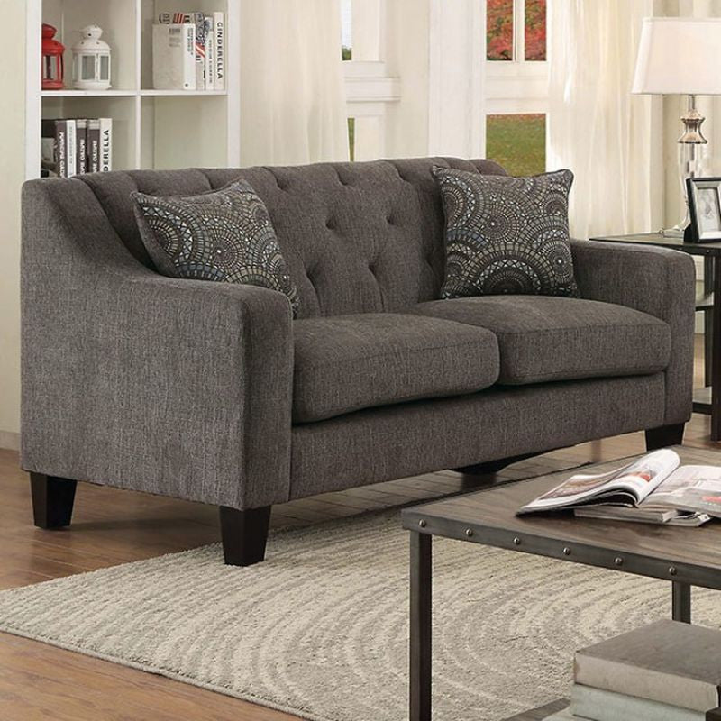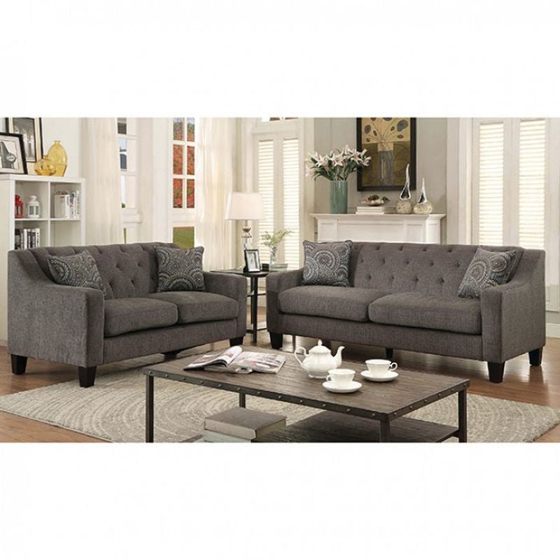 A conservative home will love the neutral color palette of this sofa set. The chenille fabric has an earthy texture that adds to the pleasant atmosphere, while the sloped arms and plush cushions are very comfortable and cozy. The accent pillows are the perfect complement, with their intricate scale pattern providing visual contrast to the solid mocha fabric. - Contemporary Style - Sloped-Style Arms - Pillows Included - Chenille Fabric - Mocha