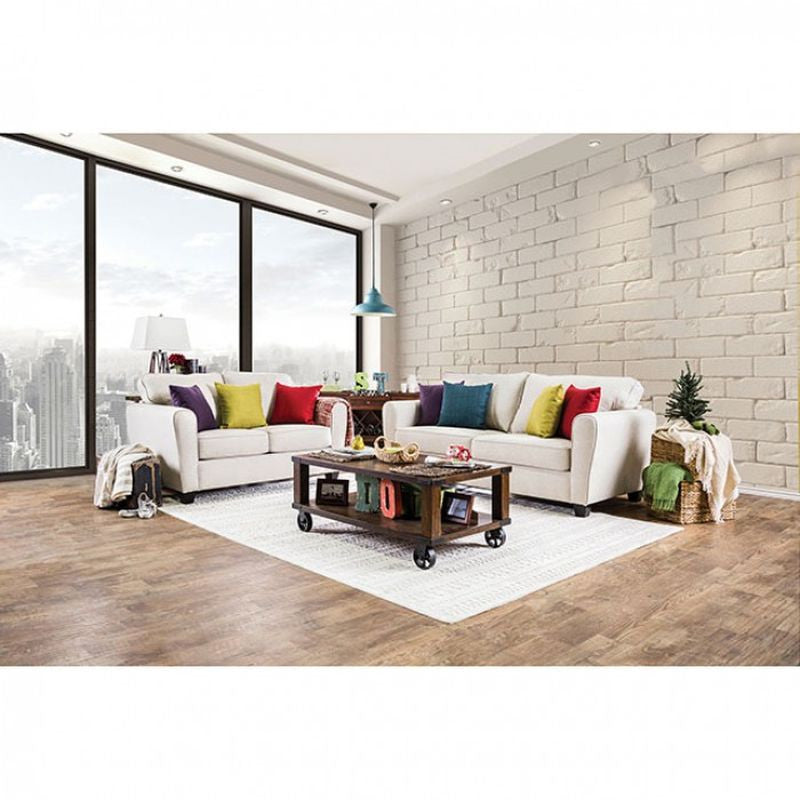 A sophisticated addition that will augment the beauty of any room, this sofa set is a must-have for any refined space. Matching welt trim outlines the unique and sloped framework while contrasting with the smooth beige upholstery. Unique patterns adorn the accompanying pillows to add a touch of voguish designs. - Contemporary Style - Welt Trim - High-Density Foam Cushions - Pillows Included - Sloped Style Arms - Beige Fabric - US-Made (Incl. Foreign Materials)