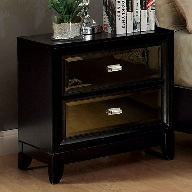 Contemporary in styling and luxuriuos in design, this night stand brings the finishing touches to any bedroom set. Featuring gold-tinted mirror front panels that give the illusion of depth, the result is a very sophisticated and decorative bedroom space. - Contemporary Style - Gold-Tinted Mirror Panels - Full Extension Drawers - Felt-Lined Top Drawers - Solid Wood, Wood Veneer, Others - Black Finish