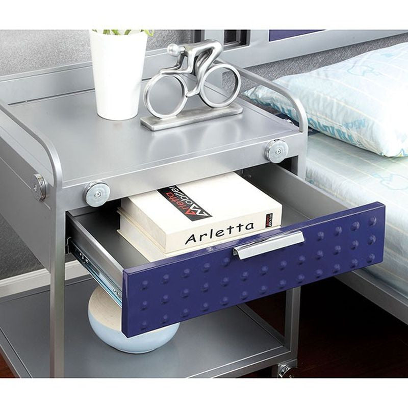 This contemporary night stand offers great style and durability, with unique metal tones in dark blue and finished in silver. - Contemporary Style - Bolt Design Accents - Silver & Dark Blue - Full Metal Construction