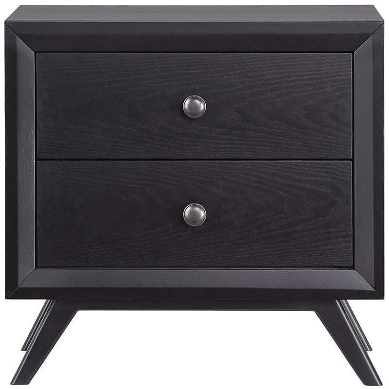 A vintage look and rich mid-century design adorn the Tracy bedroom nightstand. This finely crafted toffee brown stained piece comes with two easy-glide drawers, antique finish metal handles, and outstretched platform legs. Built upon solid edging and craftsmanship techniques, the Tracy nightstand requires assembly and wipes clean with a dry cloth.