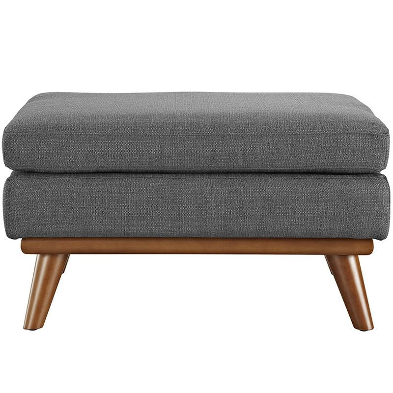 Gently sloping curves and plush cushion create a favorite lounging spot. Whether relaxing after a long day at work, settling in with coffee and brunch, or entering a spirited discussion with friends, the Engage ottoman is a welcome presence in your home. Rubber wood legs and frame supply a solid base to this quality upholstered fabric piece.