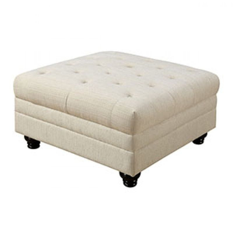 Kick it up a notch in your living space. Rest your feet upon the lovely square ottoman and feel the stress of the day melt away. From the stylish tufting to the nailhead trim to lavish bun feet, this piece will take you into a world of comfort and luxury that is all your own. - Contemporary Style - Deep Button Tufting - Leatherette or Linen-like Fabric - Nailhead Trim - Bun Feet - Ivory - Ottoman