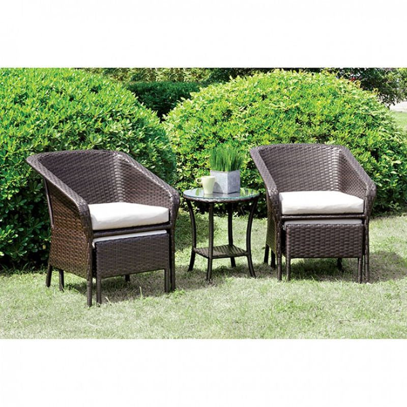 Spend some time outside with your favorite person. This five piece set is perfect for lounging and enjoying a nice glass of iced tea. Wicker arm chairs with padded fabric cushion seating are paired with coordinating ottomans and accompanied with a handy round glass top end table. - Contemporary Style - 5mm Tempered Glass Top - Espresso Wicker Frame - UV & Water Resistant - Removable Cushions - Ivory Fabric Cushions