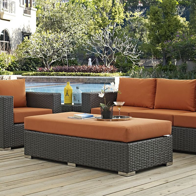 Outfit your patio with an imaginative outdoor sectional series of exceptional quality. The Sojourn series offers a robust seating experience that easily rearranges according to usage. Outfitted with industry-leading Sunbrella® fabric cushions, synthetic rattan weave, UV protection, powder-coated aluminum frame, immensely enjoy your outdoor time with a series that enhances patio, backyard or poolside areas. This installment of the series is an Outdoor Patio Rectangle Ottoman.