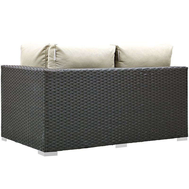 Outfit your patio with an imaginative outdoor sectional series of exceptional quality. The Sojourn series offers a robust seating experience that easily rearranges according to usage. Outfitted with industry-leading Sunbrella® fabric cushions, synthetic rattan weave, UV protection, powder-coated aluminum frame, immensely enjoy your outdoor time with a series that enhances patio, backyard or poolside areas. This installment of the series is an Outdoor Patio Right Arm Loveseat.