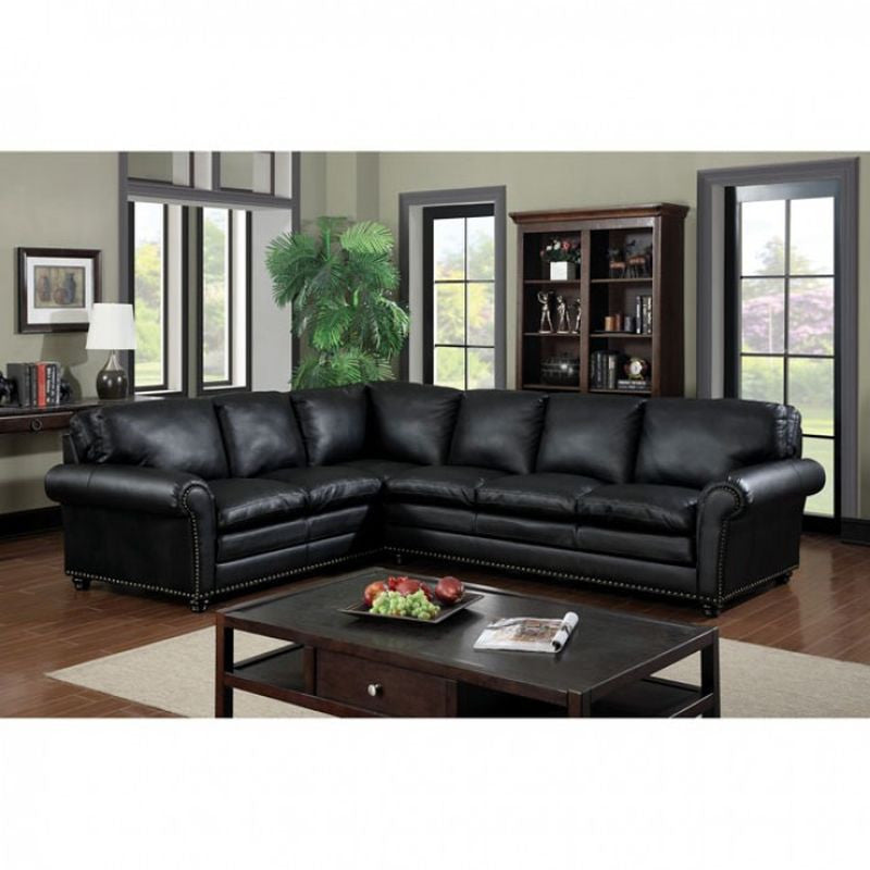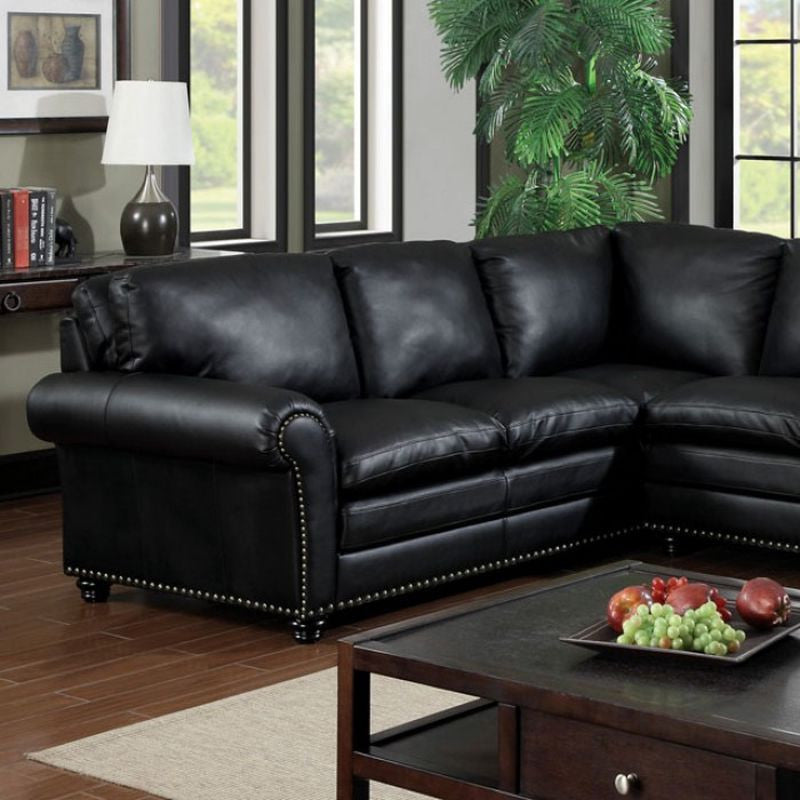 Bring a sense of comfort with this corner sofa set which features plush cushions upholstered in sleek black leatherette. - Transitional Style - Plush Cushions - Nailhead Trim - Bonded Leather Match - Black