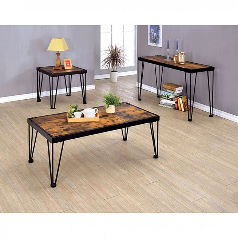 Surprise your guests with this rustic coffee table set featuring a wood and metal contrast. The table top offers a smooth texture for placement of decor pieces while the connecting legs provide a spectacular visual. This piece will surely impress your guests at the next get-together. - Industrial Style - Metal Frame Border - Triple Bar Legs - Burnt Wood Inspired Table Top - Metal, Wood, Others - Black