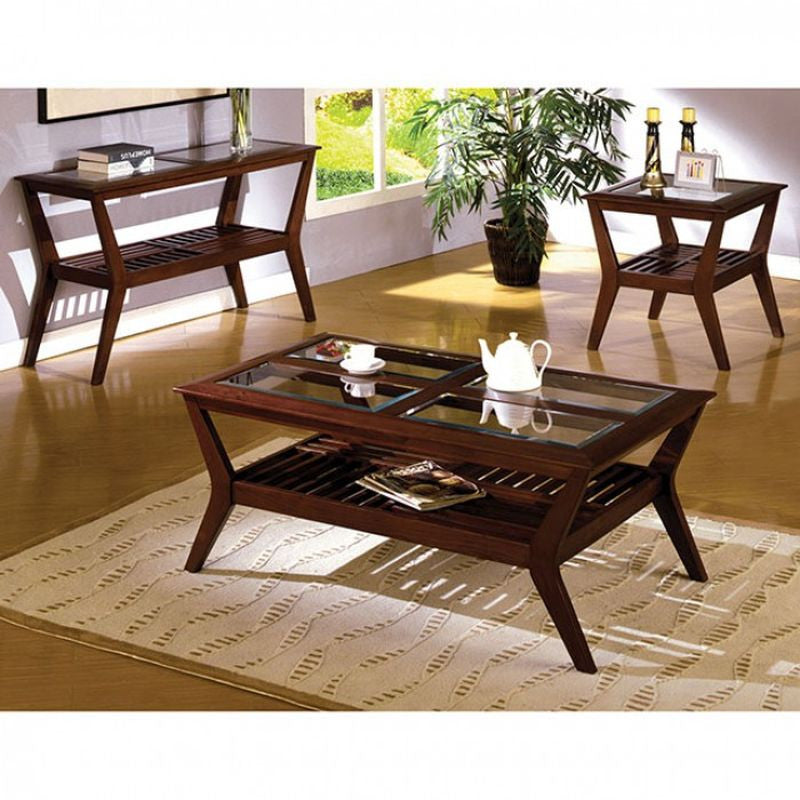 The unique angular design of this occasional table set will make a striking statement in any living room. Each table has glass inserts and an open shelf below for extra storage or display. Finished in rich dark cherry. - Transitional Style - Solid Wood, Wood Veneer, Others - Open Shelf - 5mm Beveled Glass Inserts - Dark Cherry Finish