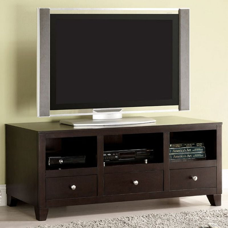 Showcase a flat screen TV on this modern console. Complete with three drawers and open shelving for media storage. Finished in espresso. - Transitional Style - Solid Wood, Wood Veneer, Others - Drawers & Open Shelves - Espresso Finish - Fully Assembled