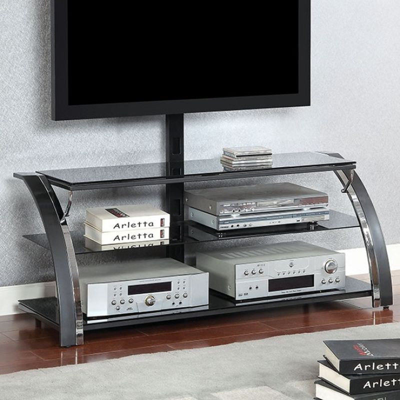 A sleek gun metal and chrome finish makes this handsome TV stand the perfect match for a contemporary room. The top is black tempered glass, and framing is all made of metal. - Contemporary Style - 8mm Black Tempered Glass Top - Metal Framing - Mount Bracket Included - Black Tempered Glass Shelves - Gun Metal & Chrome
