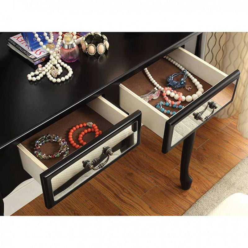 Keep your master suite up-to-date with this lovely vanity set. An oval mirror is its centerpiece while sleek cabriole legs and wavy apron add more elegance. - Transitional Style - Storage Drawers - Padded Stool Included - Padded Stool Included - Black