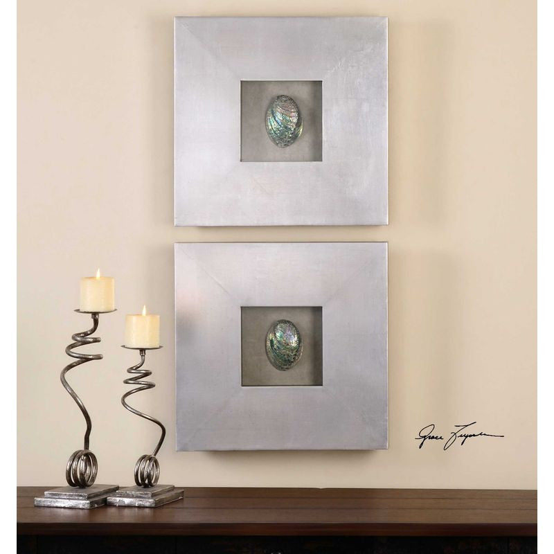Lightly antiqued, silver leaf shadow box encasing colorful abalone shells.