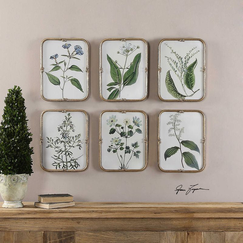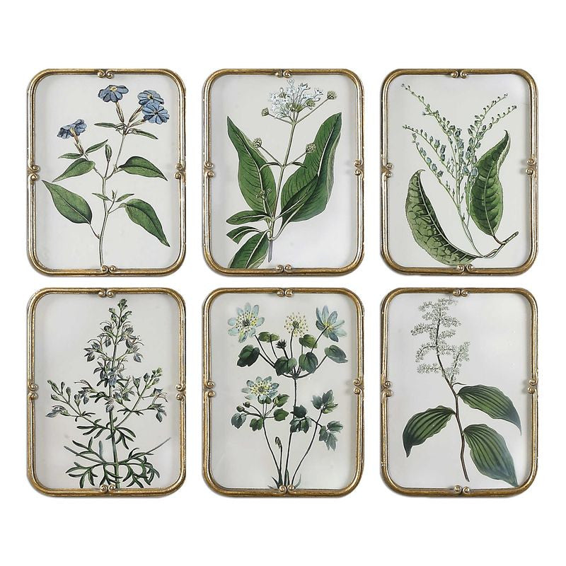 This set of lovely floral prints is accented by frames with a gold leaf finish with gray wash.