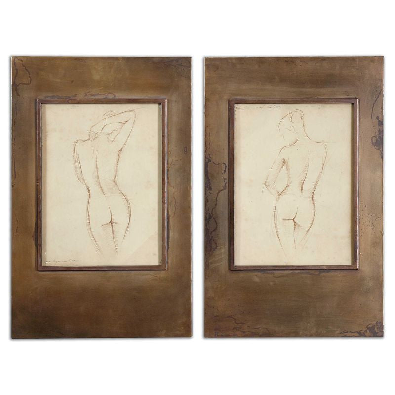 Plated, oxidized, golden bronze frames with heavy antiquing stain accent this artwork. Frame's inner lips are a darker bronze color. Prints are under glass.