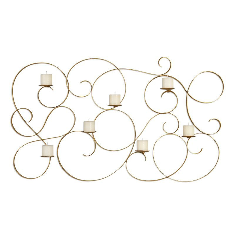 Soft flowing swirls of hand forged iron, with an antiqued gold leaf finish, create this candle wall sconce. Included are seven, off-white 3" x 3" distressed candles.