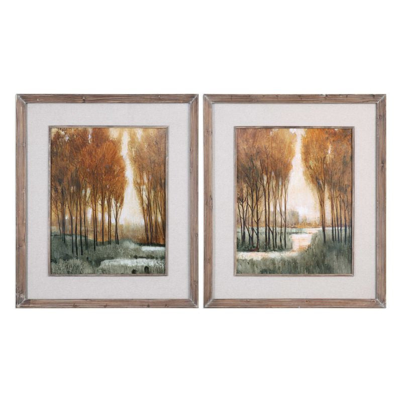 Earth tone landscape prints outlined with natural linen mats. Frames are made of rough hewn barn wood, the perfect accompaniment to the prints, and have a matching fillet accenting the mats inner edges.
