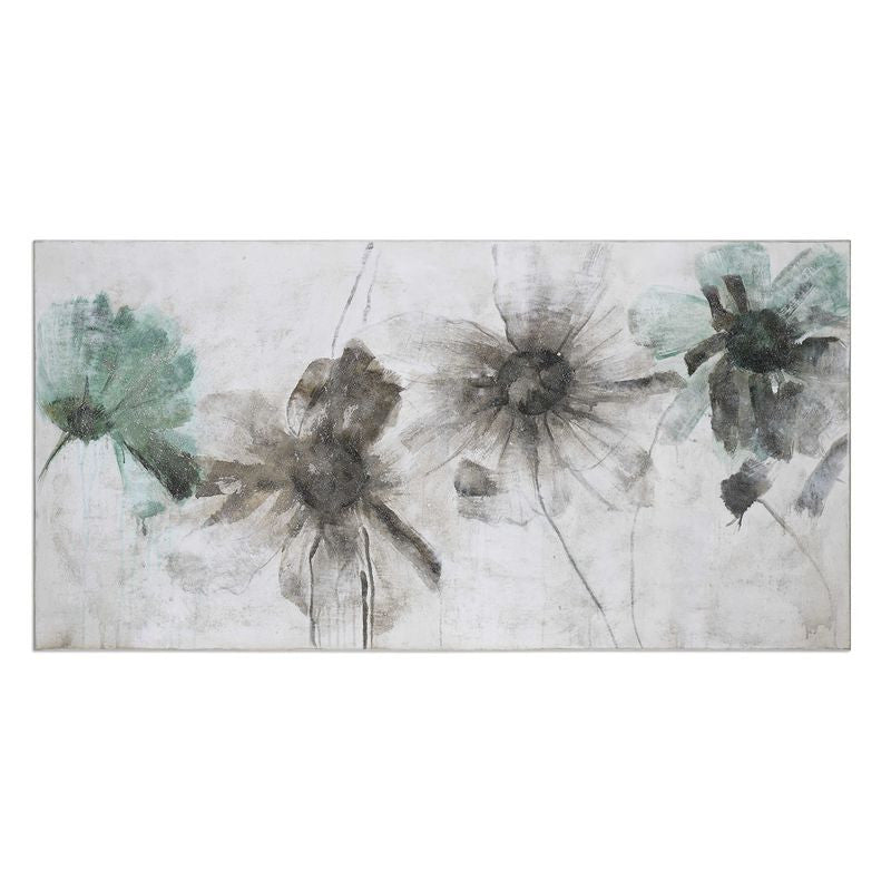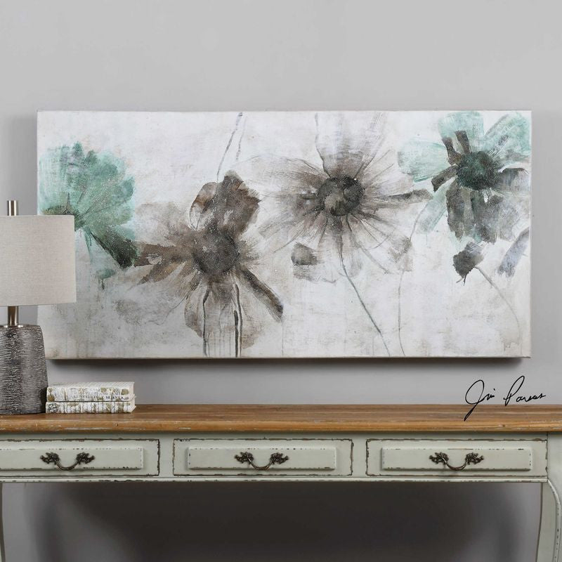 This beautiful floral rendering, including shades of grey, charcoal, brown and green is hand painted on canvas. Canvas print comes stretched and ready to hang. Due to the handcrafted nature of this artwork, each piece may have subtle differences.