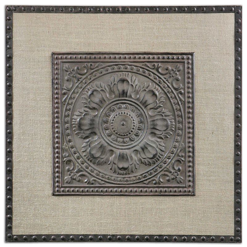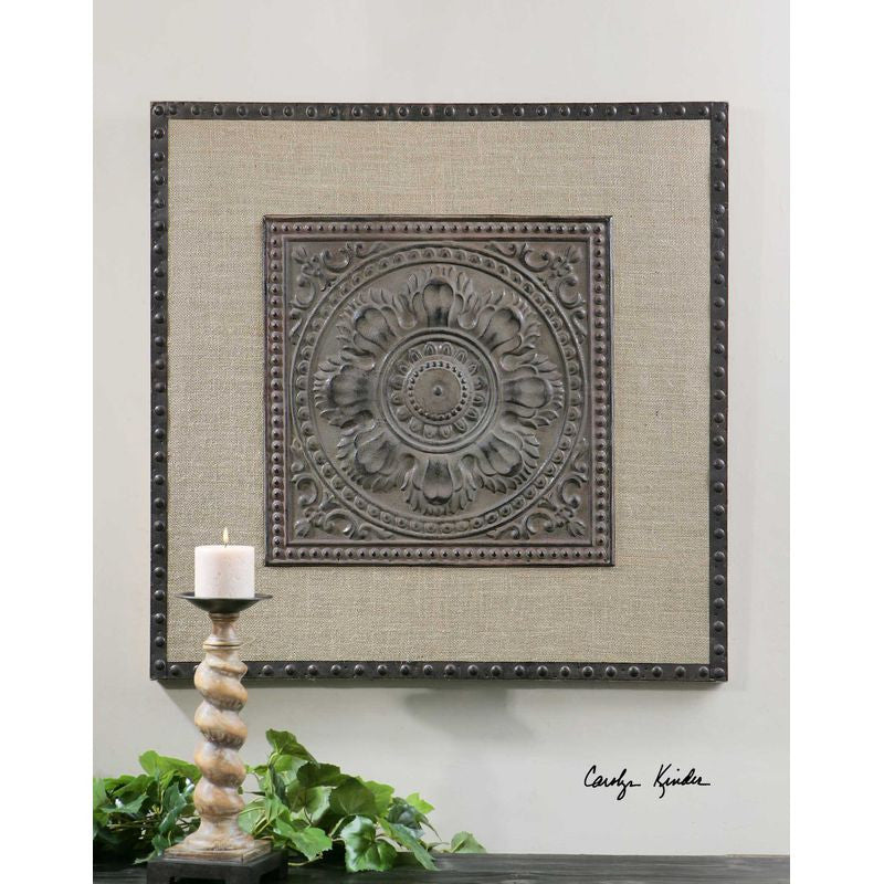 Lightly stained burlap matting with stamped metal details finished in rust bronze with a light tan wash.