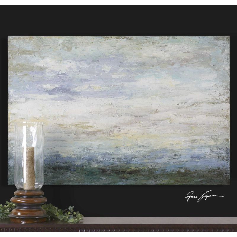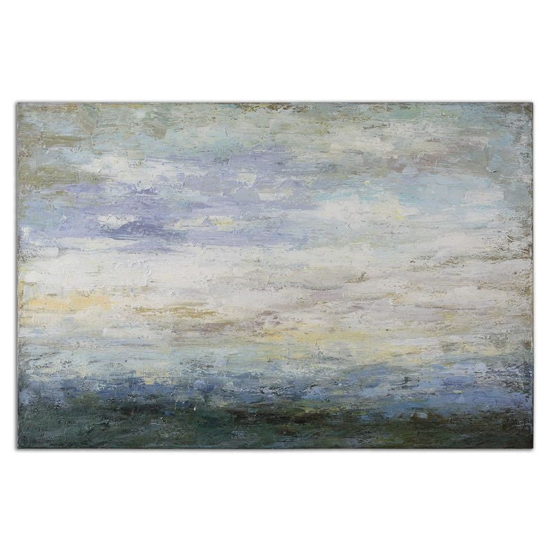 Serene, soothing colors have been used in creating this hand painted artwork on canvas with a heavily textured finish. The canvas is stretched and attached to wood stretching bars. Due to the handcrafted nature of this artwork, each piece may have subtle differences.