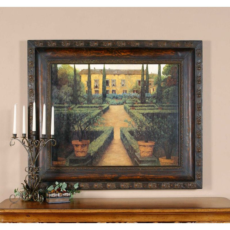 This oil reproduction is accented by a hand forged metal frame. The finish has a hand rubbed mahogany undercoat with rust distressing. The inner and outer edges feature an embossed design.