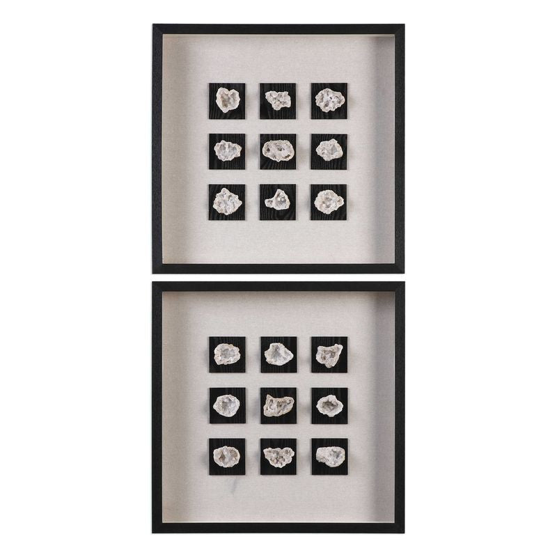 Authentic geodes in natural hues are displayed on black woodgrain matting atop a natural linen mat. A black, fir wood shadow box frame completes the display. Sizes and shapes of geodes may vary slightly.