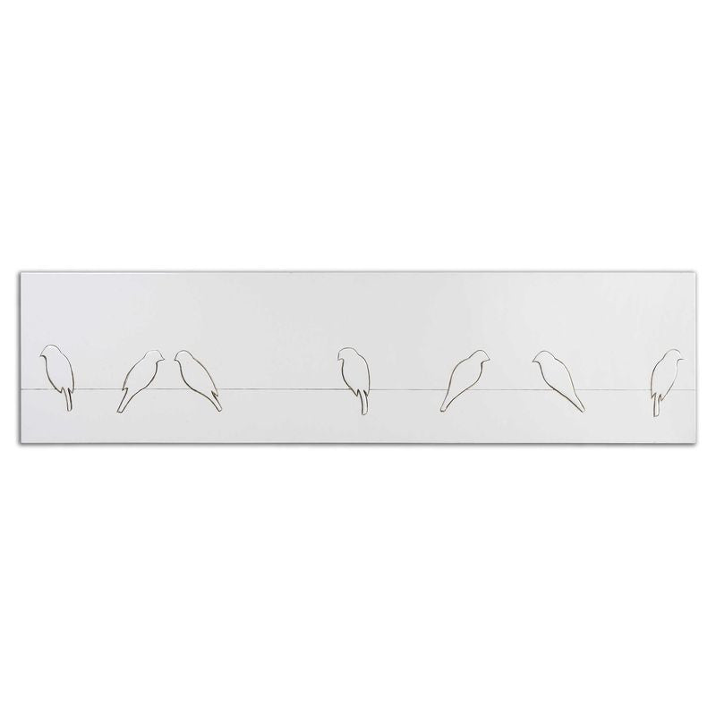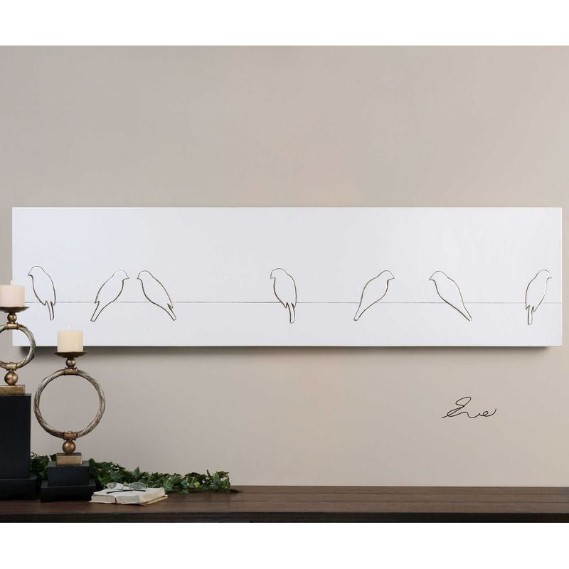 This artwork on canvas features a high gloss finish. The birds are raised to create a 3-D effect. The canvas is stretched and attached to wooden stretching bars. Due to the handcrafted nature of this artwork, each piece may have subtle differences.