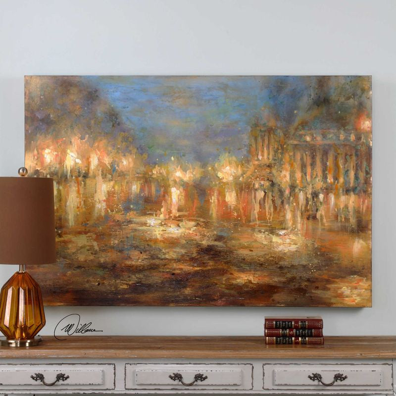 A mesmerizing array of vibrant colors are used in this hand painted artwork on canvas. The canvas is stretched and attached to wooden stretchers. Due to the handcrafted nature of this artwork, each piece may have subtle differences.