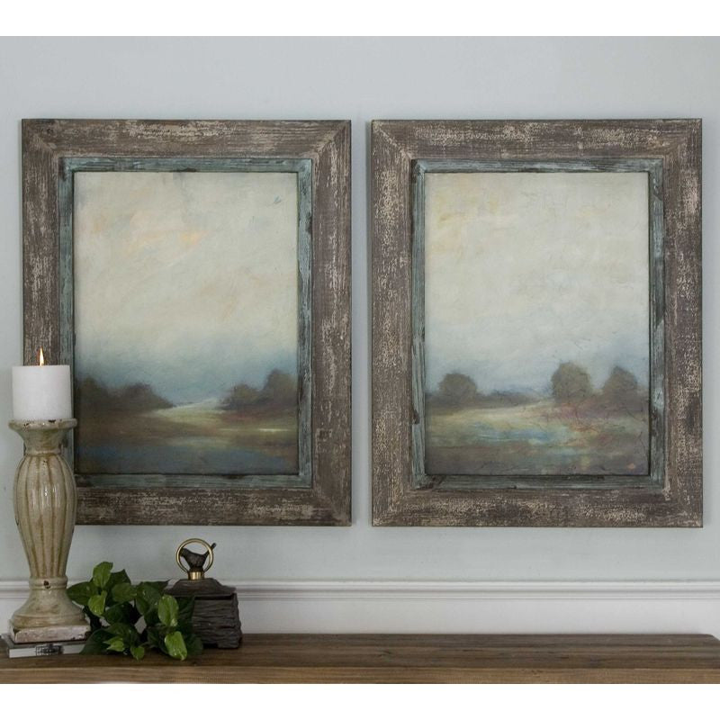 Oil reproductions have a hand applied brushstroke finish. Heavily textured, salvaged wood frames with a medium woodtone base rubbed thru to reveal underlying colors of off-white and taupe with a gray glaze. Inner lip is heavily distressed, medium brown with muted aqua accents and a heavy gray wash.