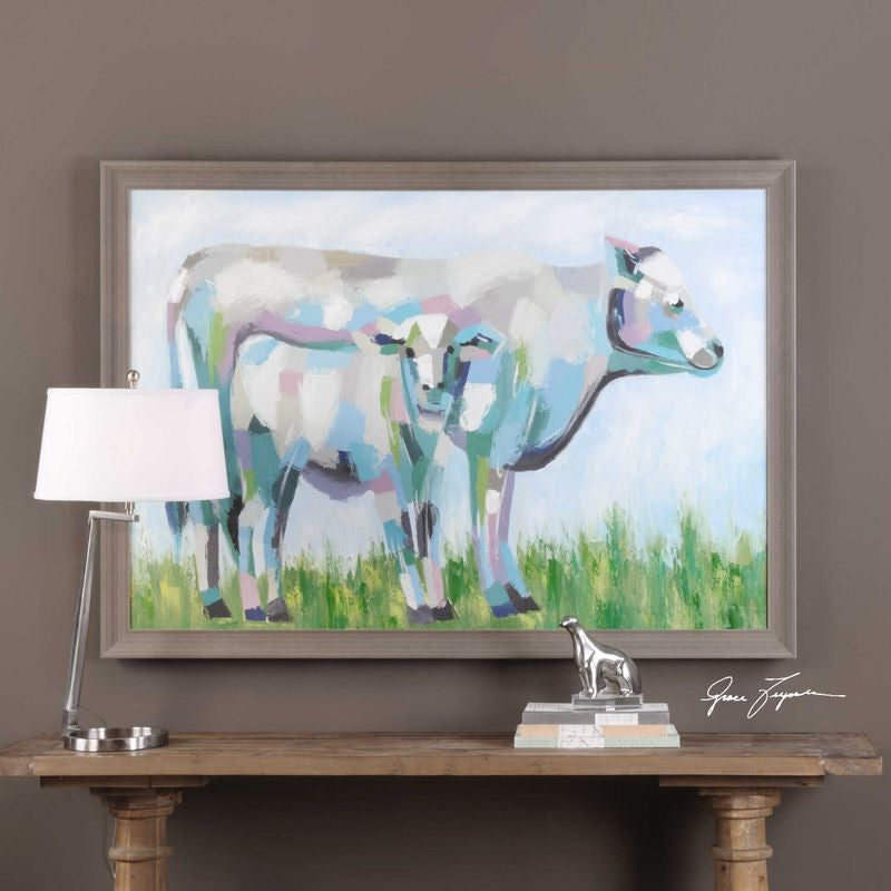 Whimsically colored, hand painted artwork on canvas that is stretched and attached to wooden stretchers. A solid wood frame with natural light brown finish completes the artwork. Due to the handcrafted nature of this artwork, each piece may have subtle differences.