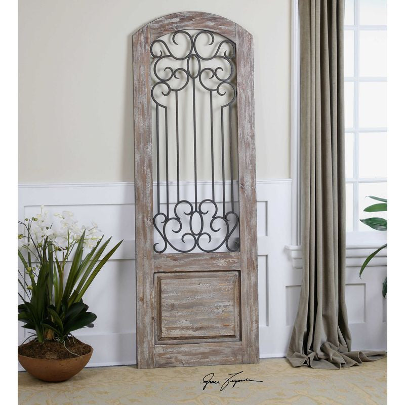 This decorative wall decor is distressed solid wood accented with a taupe gray wash and hand forged metal details finished in an aged rust bronze.
