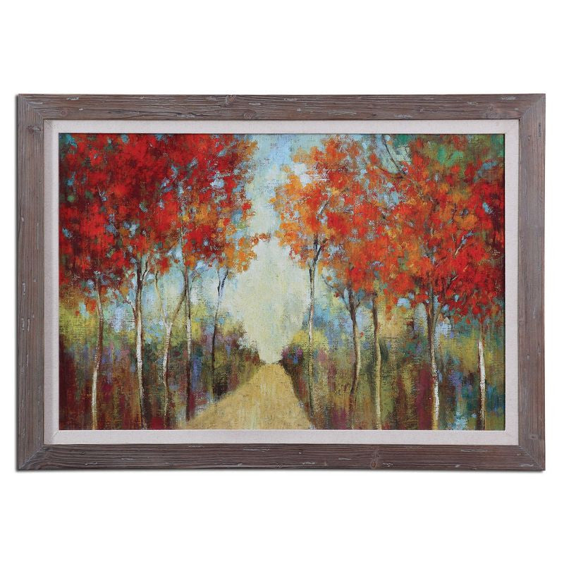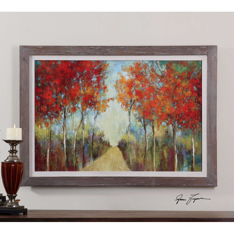 Print is accented by a reclaimed barn wood frame with a light gray glaze. The frame's inner fillet is a sand colored linen fabric.