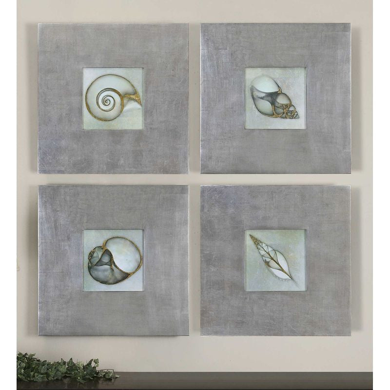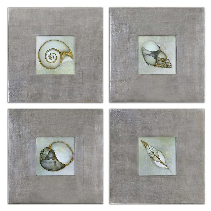 Prints are outlined with metallic accents. Frames feature a champagne silver leaf base with a light brown glaze.
