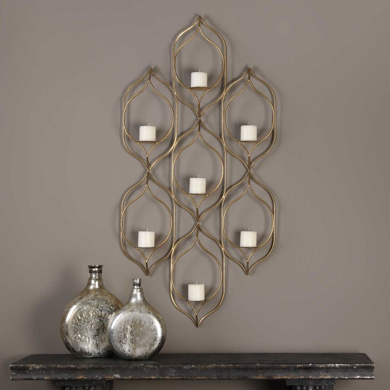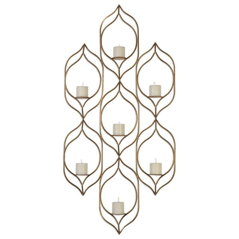Add a burst of sculptural drama to a room with this gracefully curved, hand forged iron sconce finished in antiqued gold leaf. Includes seven 3" x 3" distressed beige candles.