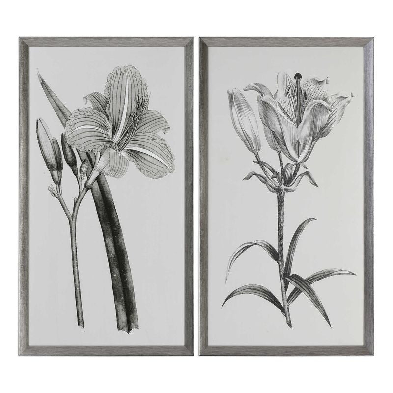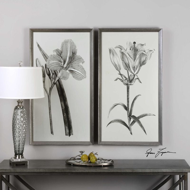Sepia tone prints feature silver and black accents surrounded by champagne silver leaf frames with black dry brushing. Prints are under glass.
