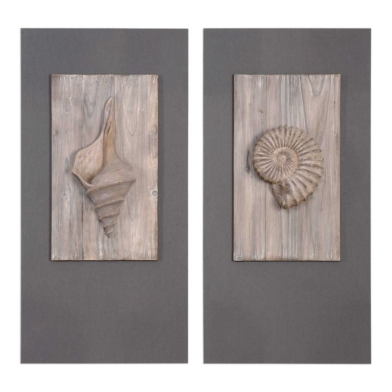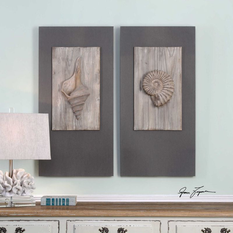 Shell sculptures featuring ivory undertones with a brown wash are applied to weathered boards finished in a light gray wash which are attached to backboards wrapped in soft, blue-gray linen fabric.