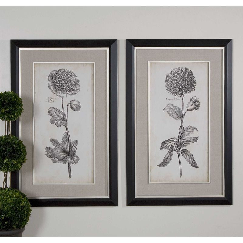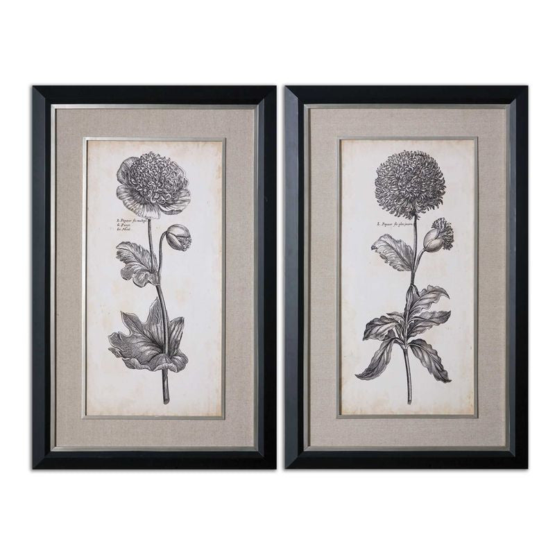 Prints are accented by sandy gray linen mats. Frames have a black satin outer edge while the inner edges and fillets are silver leaf with light antiquing. Prints are under glass.
