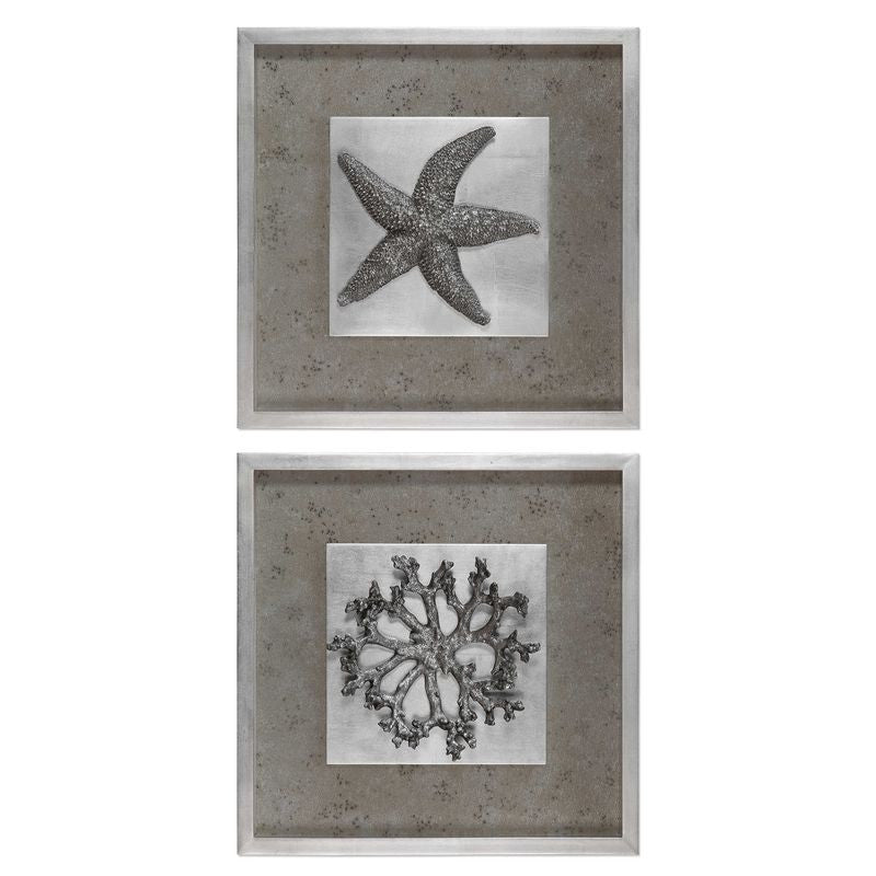 Aquatic ocean life recreated into 3-D sculptures mounted on mottled, champagne silver backboards raised slightly above the golden champagne speckled background. Shadow box frames have a mottled champagne silver finish.