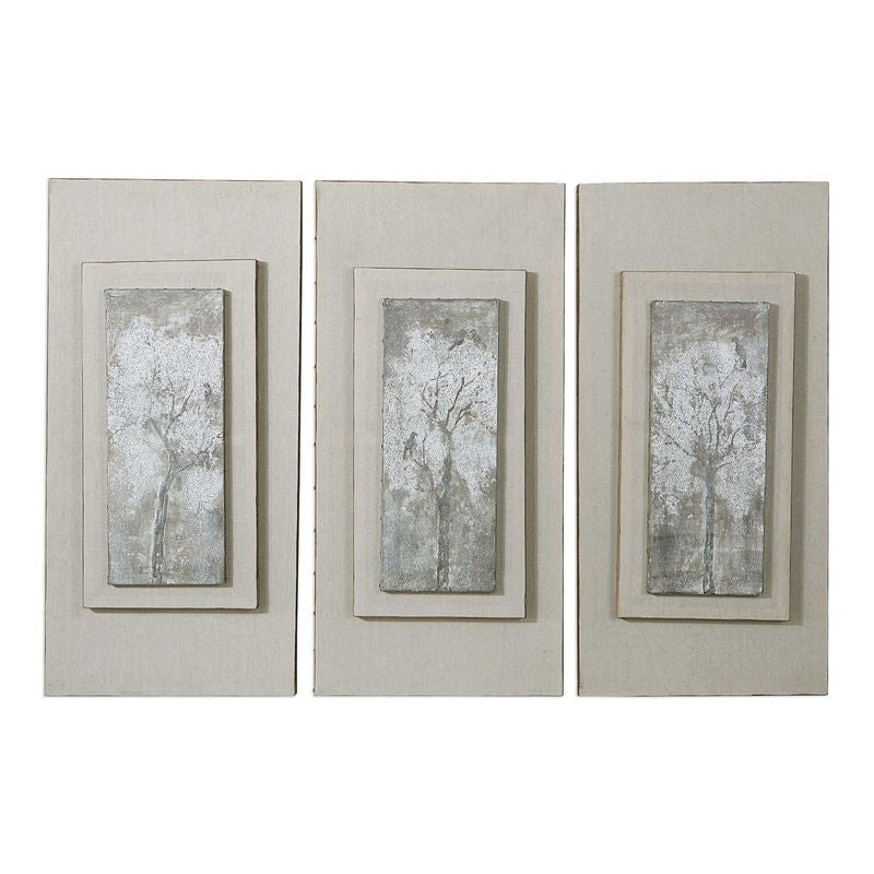 Hand painted artwork on canvas is stretched and attached to wooden frames, then layered on hardboards. Each layers outer edge has a brown wash and nail head accents. Due to the handcrafted nature of this artwork, each piece may have subtle differences.