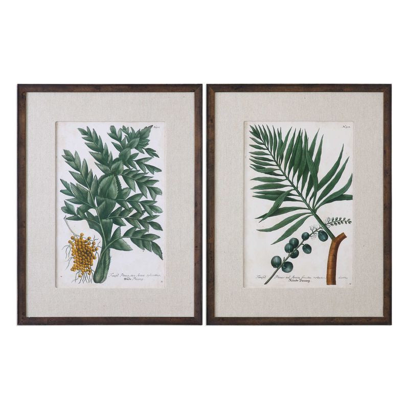Prints are accented by textured linen mats and small, distressed mahogany frames. Prints are under glass.