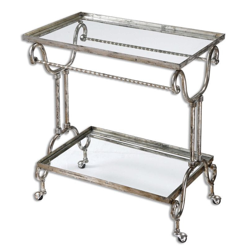 Hand forged metal with a beautifully elegant, metallic silver leaf finish, clear glass shelves and swivel casters.