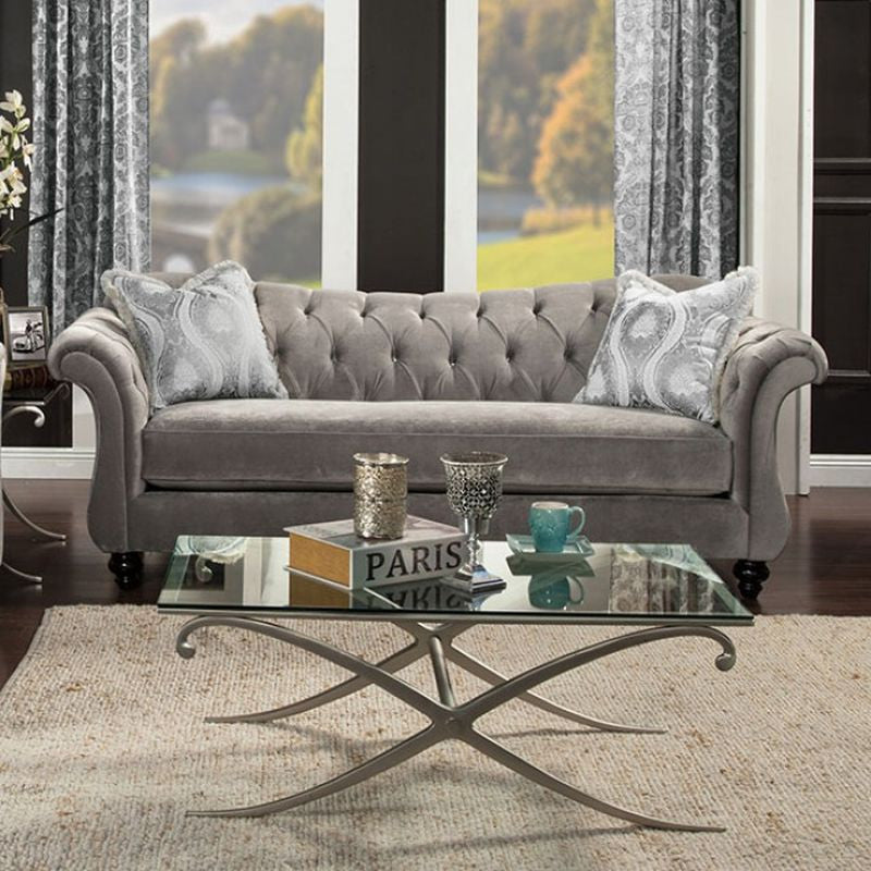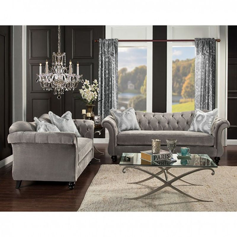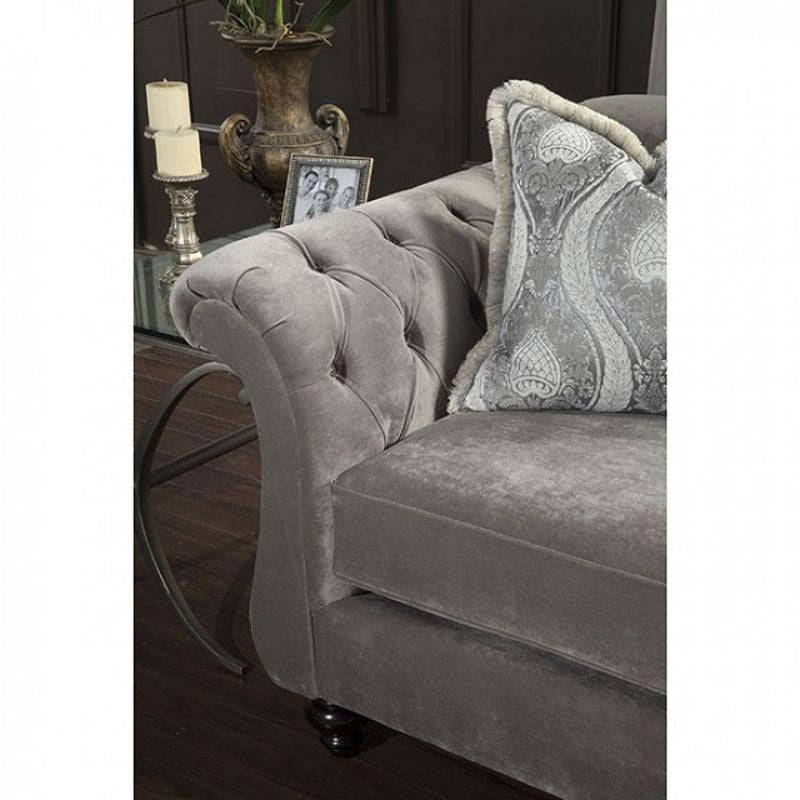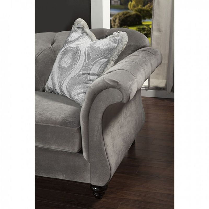 Leave a lasting impression to visitors of your home with this timeless reimagining of the chesterfield sofa. Cues from the classic design are kept with essential changes to bring it to the modern day. The reverse camelback seat and arms are deeply tufted with acrylic buttons, and velvet fabric is used for maximum comfort. Matching pillows with intricate pattern are included, for an even more upscale look that will sure impress guests and keep them talking. - Chesterfield Inspired Design - Deep Tufting w/ Acrylic Buttons - Pillows Included - Premium Velvet Fabric - Royal Yellow - Dolphin Gray - US-Made (Incl. Foreign Materials)