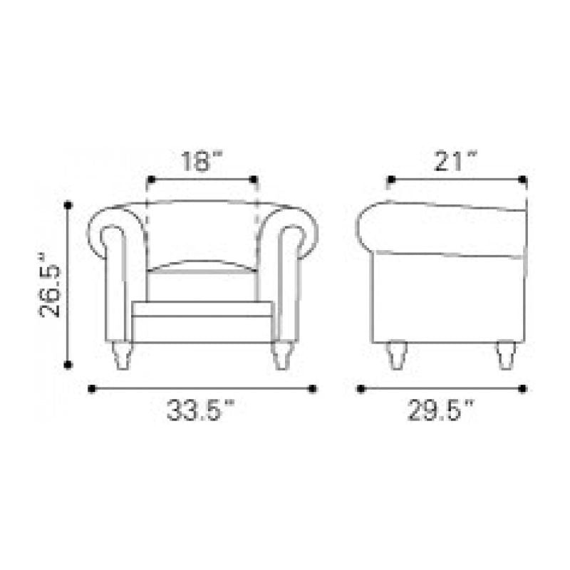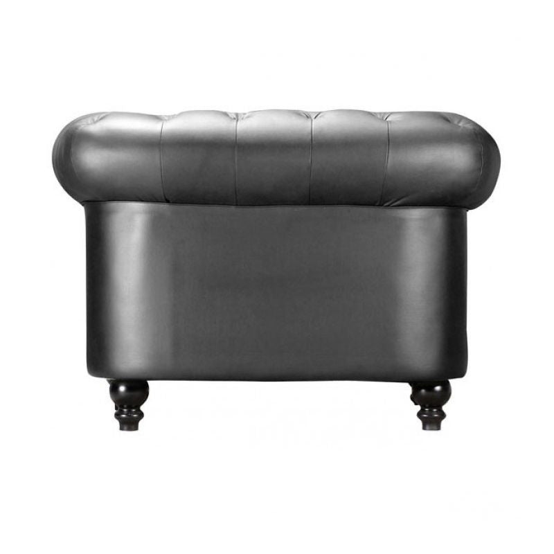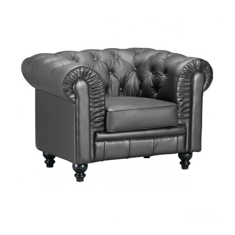 A modern take on a classic shape with ruffling, tufting, and buttons, the Aristocrat series comes in either black or white leather or silver leatherette with wood legs.