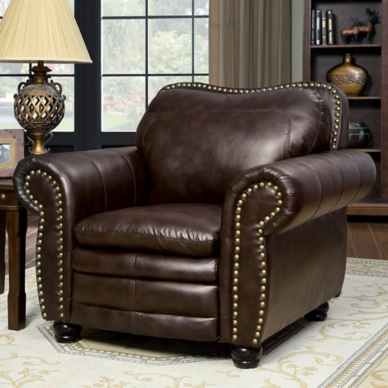 Add functionality and comfort to your room with this great sofa set. Rolled arms, padded leatherette seating and sturdy turned bun feet are just some great feature this sofa set offers. - Transitional Style - Rolled Arms - Nailhead Trim - Turned Bun Feet - Dark Brown