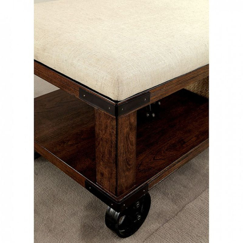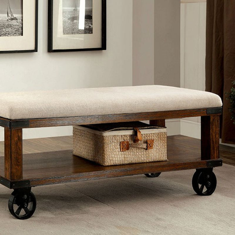The cushioned linen-like upholstery bench adds a rich visual to your living space with its wooden base and caster wheels. Add this industrial bench to your living room to provide extra seating with a flare of style. - Industrial Design - Padded Linen-like Fabric - Open Shelf - Caster Wheel Accents - Solid Wood, Wood Veneer, Others - Light Oak Finish