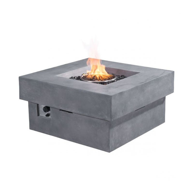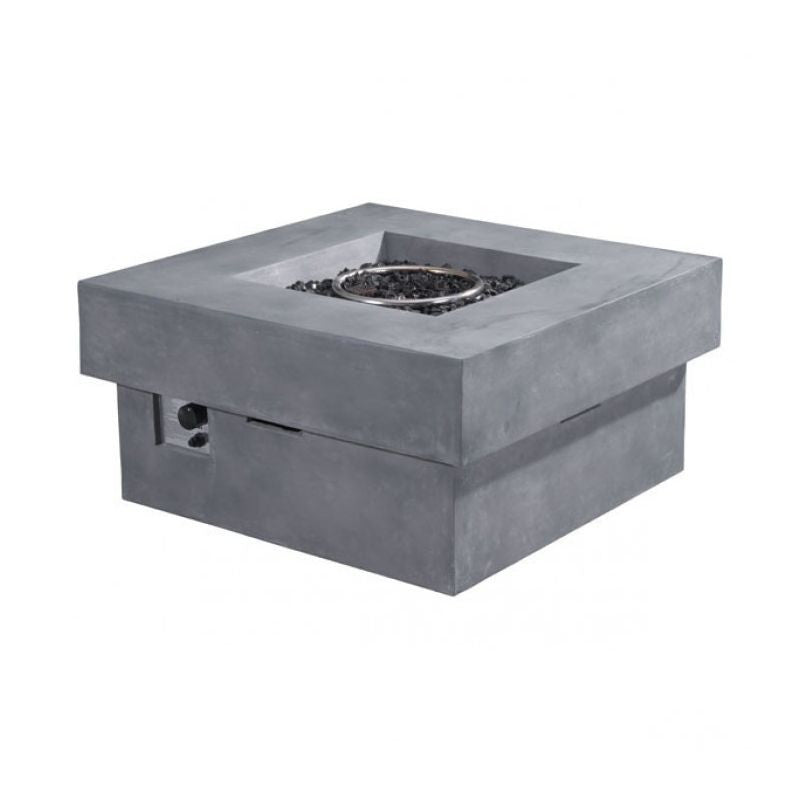 Fuctionably Modern the Diablo Fire Pit features a large mulit-tier square design, stainless steel fire burner and concrete fiber construction accented with black glass fire rocks to enhance flame. Fire pit is propane powered with BTU 50K burner and a has slim cord running from pit to matching tank cover. Propane gas not available from Zuo. See your authorized gas dealer.